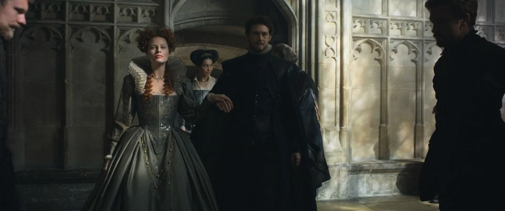 Cast: Saoirse Ronan as Mary Stuart, Margot Robbie as Queen Elizabeth I, Jack Lowden as Henry Darnley, Joe Alwyn as Robert Dudley, David Tennant as John Knox, Guy Pearce as William Cecil, Gemma Chan as Bess of Hardwick, Martin Compston as Earl of Bothwell, Ismael Cruz Córdova as David Rizzio, Brendan Coyle as Earl of Lennox, Ian Hart as Lord Maitland, James McArdle as James, Earl of Moray, Richard Cant as Thomas Andrews, Guy Rhys as Earl of Kent, Thom Petty as Earl of Shrewsbury, Izuka Hoyle as Mary Seton, John Ramm as Bull, Simon Russell Beale as Robert Beale, Maria Dragus as Mary Fleming, Liah O'Prey as Mary Livingston, Eileen O'Higgins as Mary Beaton, Greg Miller Burns as Thomas Hepburn, Aneurin Pascoe as John Hepburn, Adrian Derrick-Palmer as George Dalgleish, Kal Sabir as The Laird of Ramorny, Luke Kidd as James Haliburton, Adrian Lester as Lord Randolph, Georgia Burnell as Kate Carey, Alan Turkington as Thomas Jenye, Euan MacNaughton as William Kirkcaldy of Grange, Scot Greenan as Hector Maclean, Karen Dunbar as Commoner, Ian Hallard as Sir Richard Knightley, Andrew Rothney as King James I, Angela Bain as Snuffer Woman, Abby Cassidy as Fotheringhay Gentlewoman, Shalisha James-Davis as Fotheringhay Gentlewoman, Adam Bond as Sir William Douglas, Katharine O'Donnelly as Young Holyrood Servant, Grace Molony as Dorothy Stafford, Luke Hobson as Henry Killigrew, Ben Wiggins as John Tamworth, Eldredd Wolf as William Killigrew, Eric MacLennan as Portrait Painter, Nathen East as Andrew Ker of Fawdonside, Daniel Booroff as Knox's Secretary, Sean Buchanan as Francis Yaxley, Matthew Pidgeon as Wedding Announcer, Benjamin Barraclough as Officer, Jordan Turk as James MacDonald, Adam Stevenson as Urie Campbell, Scot Greenan as Hector MacLean, Chris Grahamson as Moray's Drummer, Ed Jones as William Taylor, Owen Gorman as Bishop, John Stahl as Fisherman, Kadiff Kirwan as Attaché, Alex Beckett as Sir Walter Mildmay, Will Rowlands as Soldier